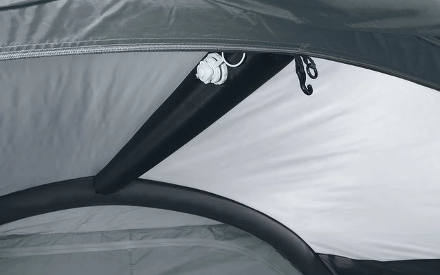 In der Lieferung enthalten sind die Zelthaut, der Zeltboden, 3 Luftschläuche, 2 Aufstellstäbe, einen Schleusenstab, eine Luftpumpe, Abspannmaterial und ein Packsack. Der Auf- und Abbau des Vorzelts ist schnell und einfach, da das Gestänge aufblasbar und der Boden eingenäht ist.