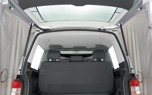 Die vielseitige Konstruktion des Heck-Vorzelts Easy Camp Crowford schafft flexibel nutzbaren Raum für VW-Bus Camper. Es ist die ideale Wahl für den VW T5 bzw. T6 California. Mit zwei Abspannleinen wird es sich sicher an der Heckklappe befestigt. Darüber hinaus verfügt es über eine Tür mit angenehmer Durchgangshöhe, die zum Schutz vor Sonne und Regen hochgeklappt werden kann. Entworfen für das Heck eines VW California T5/T6 Stahlstangen für das Vordach über der Vordertür enthalten. Verdeckte Lüftung auf der Vorderseite Fenster mit aufrollbaren Vorhängen an beiden Seiten. Ausgestattet mit Befestigungshaken mit Klappen zum Schutz der Kanten am Heck.