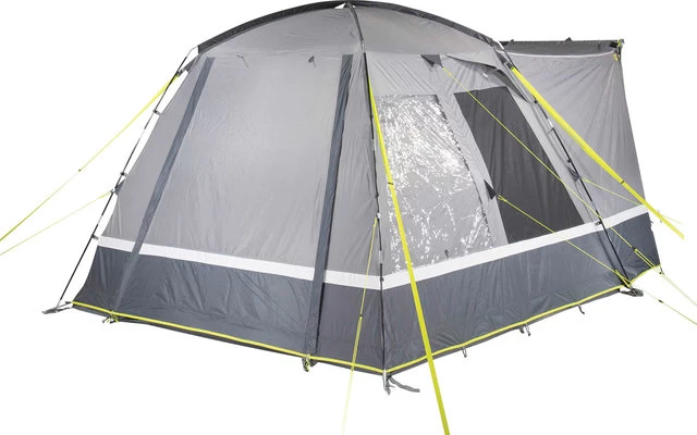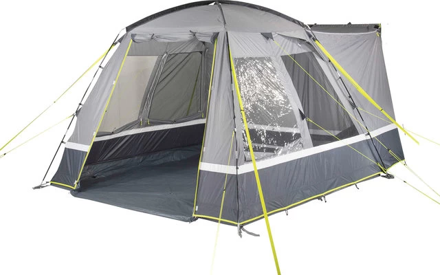 Die rechten Seitenwände bieten ein optimales Raumgefühl. 3 Dachstützgestänge stabilisieren das Zelt. Das Vordach mit Wetterblenden schützt vor Wind, Regen und bietet Schatten. Der fest vernähte Boden mit dem Außenzelt verhindert das Eindringen von Schmutz, Nässe, Krabbeltieren und schützt vor Zugluft. Die Verandafront lässt sich je nach Wetterlage bis zur Mitte oder ganz öffnen. Die Bodenwanne kann an der Front herunter geklappt werden und verhindert Stolperfallen. Gazefenster aus extra starkem, reißfestem 150D „Superfine“ Moskitonetz belüftet den Wohnbereich und halten Insekten aus dem Zelt fern. Die innenliegende Reißverschluss Fensterklappe ist einfach zu bedienen und wird variabel als Dauerventilation eingesetzt. Gaze-Seitentür aus 150D „Superfine“ Moskitonetz für mehr Bewegungsfreiheit und Belüftung. 2 Klarsichtfolienfenster mit innenliegenden Reißverschluss- Fensterklappen können einfach und variabel bedient werden. Eine Hochentlüftung belüftet das Zelt an regnerischen Tagen.
