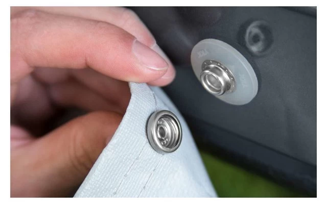 Ein Klemmprofil sorgt für die Verbindung der Seitenwand mit dem Markisentuch. Beide Seitenteile sind mit einem ReißverschIuss für optimale Verbindung zur Vorderwand ausgestattet. Die Profile mit doppelten Gummilippen stellen eine perfekte Abdichtung zwischen Fahrzeugwand und Zeltwände her und sorgen für optimale Spannung. Die Diagonalstützen zwischen Mast- und Klemmprofil bieten ausgezeichnete Stabilität.
