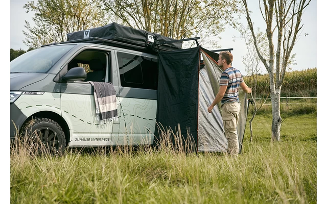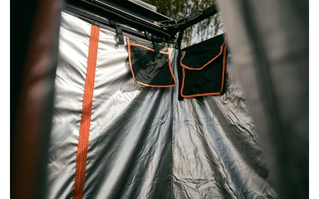Das Duschzelt kannst du über ein Schienensystem individuell an deinem Dachträger montieren. Über zwei ausklappbare Leisten ist das Duschzelt in weniger als zwei Minuten einsatzbereit. Oben findest du eine Vorrichtung, an der du den Wasserbeutel aufhängst. Nach unten hin ist das Duschzelt offen damit das Wasser im Boden versickert oder abläuft. Damit deine Wasch-Accessoires nicht am Boden liegen müssen, gibt es zwei Taschen in denen du Seife und Co. verstauen kannst.