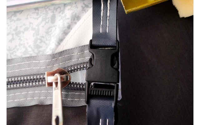 Zum Standardlieferumfang des Patio gehören 2 Seitenwände mit Fenster. Diese sind durch Reißverschlüsse abnehmbar. Powergrips, Sturmgurte und Gardinen für die Seitenwände sind gegen Aufpreis erhältlich. Das Patio wird serienmäßig geliefert mit Keder und 3 Dachhaken zur Befestigung direkt an den Wohnwagen. Die Seitenwände können Sie nicht benützen beim Patio direkt am Wohnwagen.